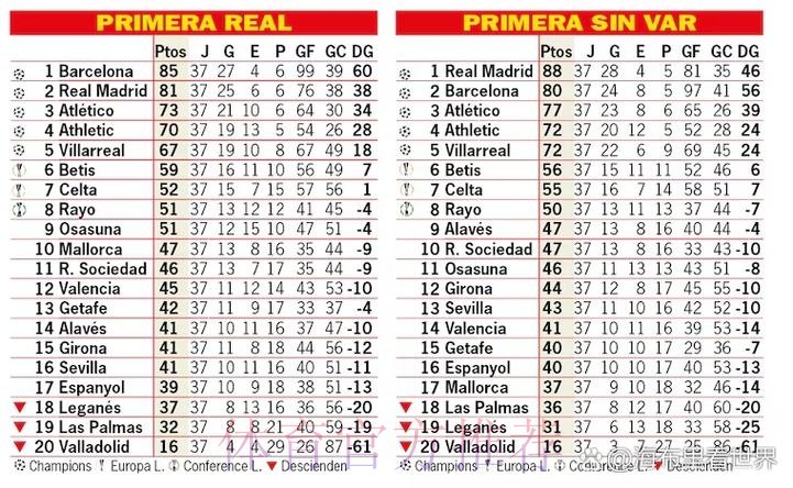 要理解这一说法的内核 首先要看它构建假设的方式。媒体在回溯整个赛季时 通常会按照以下路径进行推演 一是统计所有由VAR直接导致结果改变的判罚 包括判给或取消的点球 改判的红黄牌 以及因越位线判定而被吹掉或确认的进球 二是将这些判罚对比赛最终比分的影响量化 例如 一粒被VAR取消的进球 原本会让皇马从平局变为胜利 那么在“无VAR版本”的积分表中 皇马就多得两分 三是对巴萨进行同样的回溯对比 由此计算出“净积分差”。在这一套逻辑中 《阿斯》得出的结论是 如果完全剔除VAR介入带来的所有连锁反应 皇马在本赛季的积分榜上将领先巴萨多达8分 形同提前锁定冠军。这种推演未必完美 但它至少试图用可追溯的技术判罚记录来支撑一个核心观点 VAR正在实实在在地改写争冠格局 而受影响最大的或许正是皇家马德里。